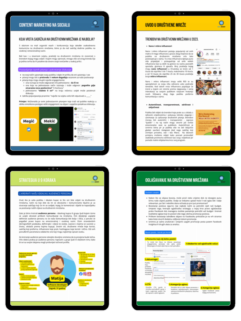 Naručite e-book koji na detaljan način i kroz primjere iz prakse daje uvid u funkcioniranje marketinga na društvenim mrežama. Proučite 80 stranica materijala za marketing na društvenim mrežama uz brojne primjere iz prakse, savjete i trikove.